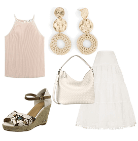 Un look fresco y delicado: tonos neutros, texturas livianas y accesorios artesanales. Ideal para un día calmo al aire libre con vibra bohemia.
