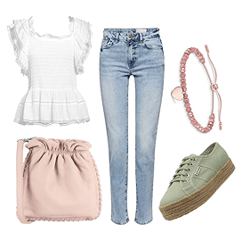 Blusa romántica, jeans claros y complementos suaves. Un outfit cómodo y femenino, perfecto para un momento de relax con estilo boho chic.