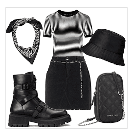 Un look cómodo y con actitud: rayas, falda negra y botines chunky. Ideal para un día relajado sin perder tu estilo rockero.