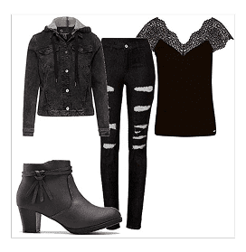 Jeans rotos, campera denim y blusa con encaje para equilibrar fuerza y suavidad. Perfecto para una salida tranquila con vibra rockera.